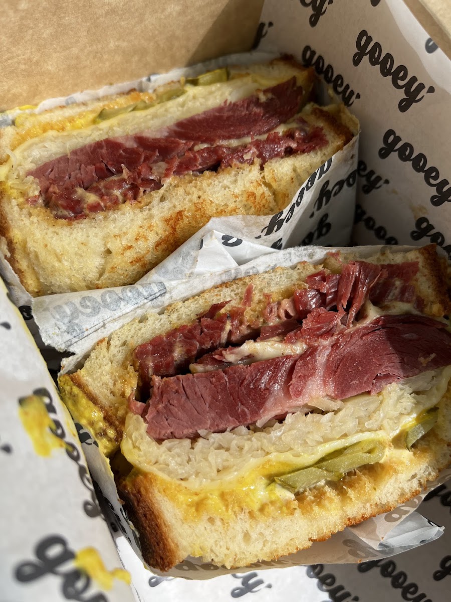 The moment you step inside, you're greeted by friendly staff and an aesthetic that combines modern charm with a cozy bakery touch; the striking "Gooey" neon sign beckons from the entrance. The café is a hive of activity, with the buzz of customers enjoying their meals and the delightful sight of bakers crafting fresh treats behind the window.
